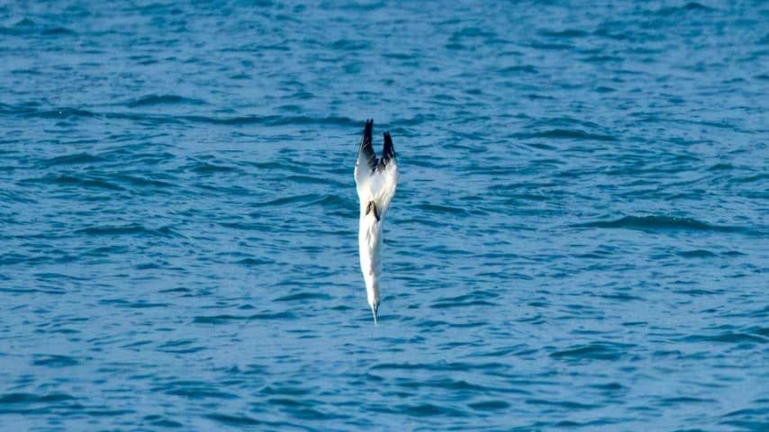 Ma se si sa dove cercarle, con un pizzico di pazienza e fortuna si può assistere a uno degli spettacoli della natura più affascinanti: la loro tecnica di pesca. Le sule, infatti, scrutano sotto la superficie dell'acqua alla ricerca di pesci da decine di metri di altezza, grazie alla vista acuta; quando li individuano fanno una virata verso il basso, stringono le ali al corpo e assumono una posizione a freccia, quanto più aerodinamica e idrodinamica possibile. Potete vederla nella foto qui di seguito. Non c'è da stupirsi che abbia ispirato il design e la progettazione di alcuni caccia militari, come l'F-111 e l'F-15.