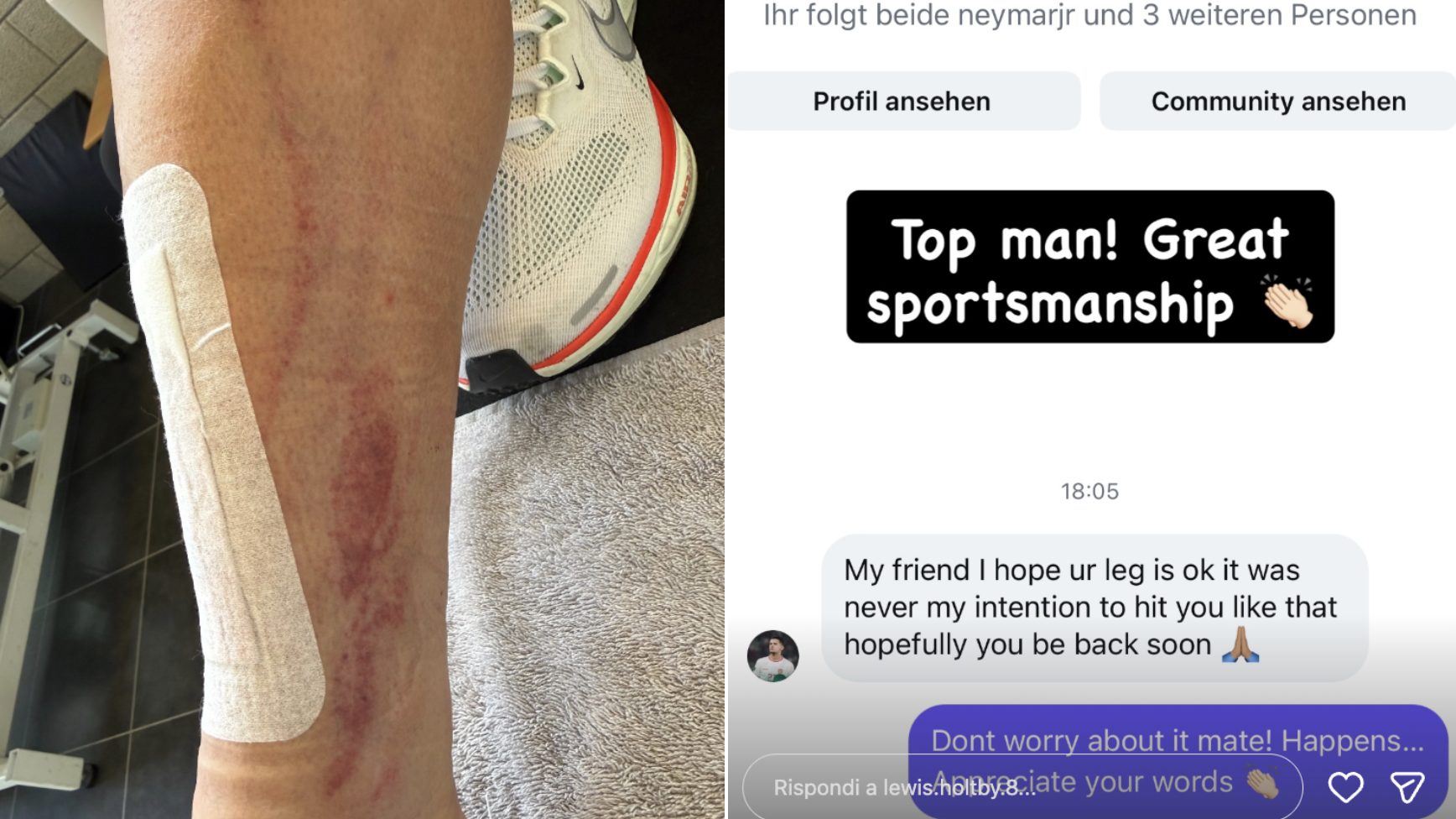Holtby ha poi mostrato sui social i segni dell’intervento subito: dai graffi causati dai tacchetti, alla ferita ricoperta dal cerotto con parole di ringraziamento per i tanti messaggi ricevuti. Tra questi anche quello di Hubner che ha inviato un Direct al suo avversario scusandosi: “Amico mio, spero che la tua gamba sia ok, non era mia intenzione colpirti così. Spero che tu possa tornare presto”. Cordiale la risposta del calciatore del NAC: “Non preoccuparti amico, succede! Ho apprezzato le tue parole”. Applausi.